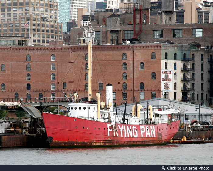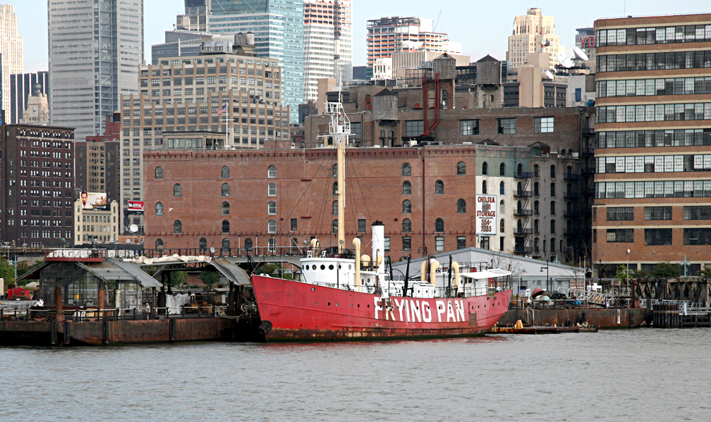 There appears to be no end to ingenuity and appropriation in this city, particularly when it comes to business. The Frying Pan was unknown to me until Sunday, when I photographed it on a neighborhood boat ride. This historic boat, built in 1929, was used as a lightship at Frying Pan shoals off the coast of Cape Fear in North Carolina, a notoriously hazardous area for ships (lightships or lightvessels are used in place of lighthouses where the water is too deep for a lighthouse). The Frying Pan was finally decommissioned in 1967. It then served a number of uses at various locations until it capsized and sunk in Chesapeake Bay in 1984. The ship remained underwater until 1987, when she was raised, restored, and moved to NYC’s Pier 63 and docked to a Lackawanna railcar barge.