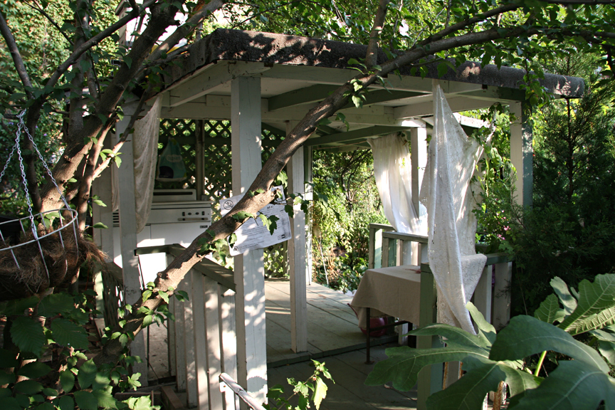I recently visited with a friend. Upon entering, we took a pathway through a tunnel of shrubbery which felt like an English country garden. Then we passed through a small cabana (in the photo), which felt like a tiny country cottage. From there and out into the open, much of the garden has a tropical feel, with dense foliage and plantings. I used to travel to the West Indies, and this space truly made me feel like I was there again. There was barbecuing and picnicking going on in a tented area. Nearby, there was a large cabana with a porch, chairs, benches, tables, a kitchen with appliances, and housekeeping accouterments. I spoke with the women relaxing and expressed my awe. They confirmed my feelings that this garden was the best in NYC 🙂