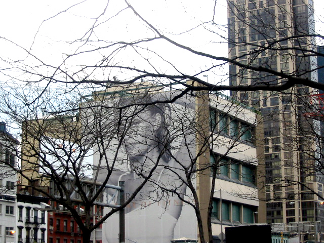 This one is near the Roosevelt Island tram and the 59th Street Bridge, so oncoming cars and people standing on the tram and the platforms over the street will see her. The branches have softened and integrated her somewhat. Here are two more examples near Houston Street. One is more daring than most since the model is close to exposing her entire breasts (not done in the U.S. in public advertising). The other shows a model’s face, duplicated and inverted, integrating it into the architecture it adorns and acts as an ad for.