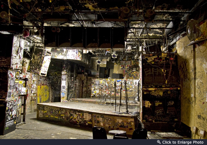 Last summer, I asked a photographer friend to accompany me on a final pilgrimage to CBGB, knowing it was to close in October of that year. So, on a hot August Sunday afternoon with the city deserted, we headed with our cameras to 315 Bowery and home of the legendary rock club. We were pleasantly surprised with our reception – the person attending welcomed us with open arms, saying that the owner, Hilly Kristal, had always supported and encouraged photographers. So rather than having to whine, beg, or sneak around taking harried photos surreptitiously, we were able to indulge and take our time.