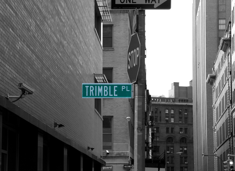 Trimble Place is very uninteresting and drab, with no outstanding features or businesses and very little history other than it was named in 1874 for George Trimble, a 19th-century merchant, director of New York Hospital and an officer of the Public School Society. The most interesting things about the alley are the buildings that surround it, like the controversial 52-story residential tower next door and the bizarre, 550-foot, monolithic, windowless AT&T Long Lines Building at 33 Thomas Street. There are actually many small alleys like this in lower Manhattan: Mosco Street, Florence Place, Benson Street, Ryders Alley, Mill Lane, Mechanics Alley, and Jersey Street. And in the Village, there are several which are residential and much more bucolic and historic in nature, such as Grove Court, MacDougal Alley, and Washington Mews. Unlike most of Manhattan, the mayhem of small streets and alleys downtown is due their creation prior to the Commissioners’ Plan of 1811, which established an orthogonal grid north of 14th Street.
