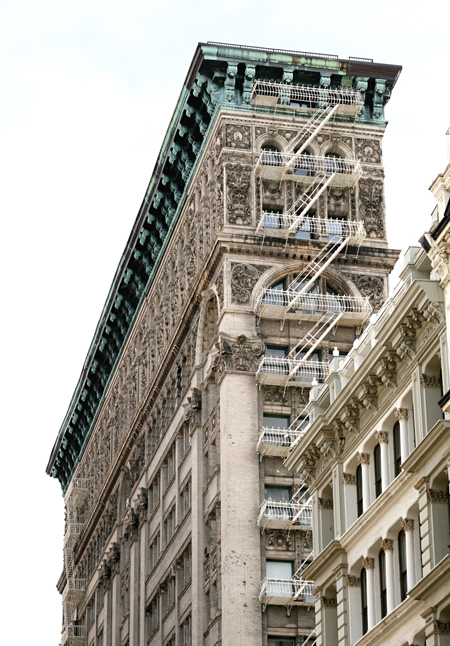 This magnificent building at 451 Broome Street in the SoHo Historic District caught the eyes of a couple of photographer friends and myself on a recent walk. I could find no details on this building specifically. Amazing, since in another locale, something of this quality would be worthy of group tours. But SoHo is packed with quality structures, so a building has to really stand out in an extraordinary way architecturally or historically to make itself known.