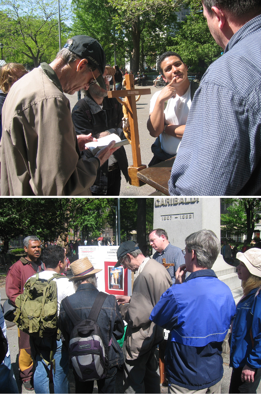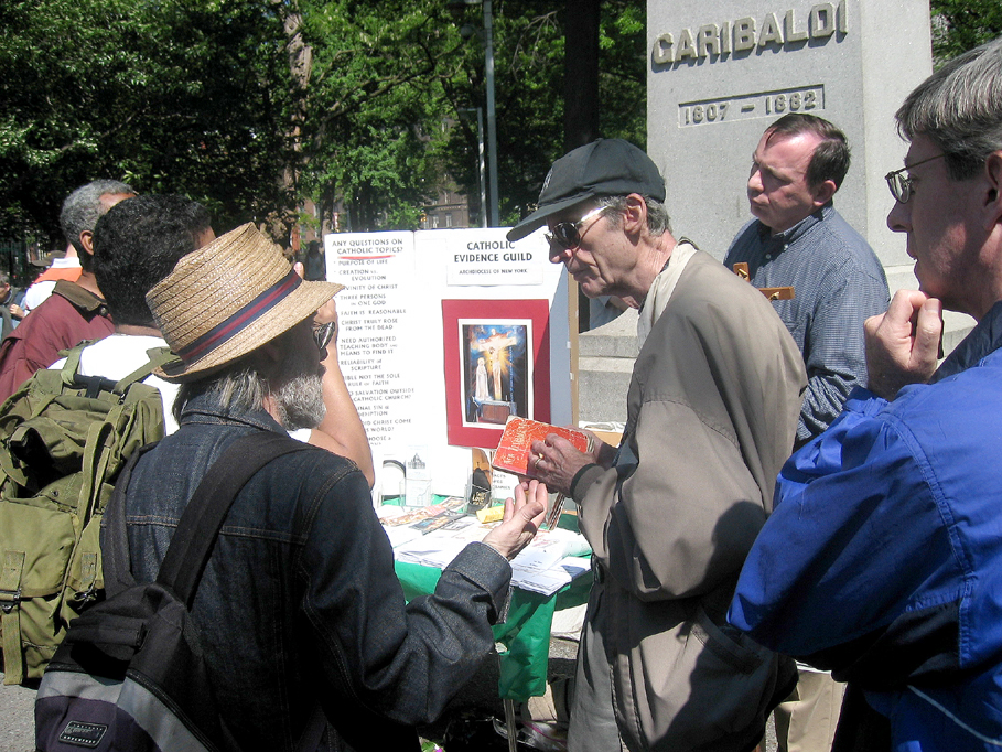 For me, this was New York at its best. An organization called the Catholic Evidence Guild had set up in the park with a table, literature, a podium, bibles, and a crucifix to spread the word and convert. However, even though this was the street and one would not expect to be confronted with any real challenge to the seasoned Christian, this is New York, and you had better be prepared for anything – eccentrics, cranks, derelicts, students, academics, etc. And anything they got.
