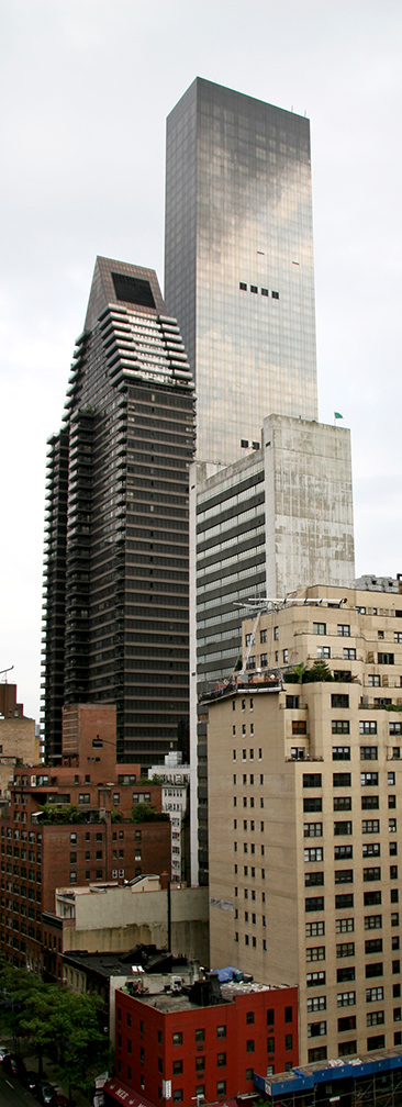 This building was the tallest in the area until it was eclipsed by the 72-story Trump World Tower (seen to its right in the photo) across First Avenue between 47 and 48th Streets. Surprisingly, I have read a number of positive reviews from architecture critics such as Herbert Muschamp. Designed by Polish architect Marta Rudzka and completed in 2001, it was built amid some controversy (of course) concerning its height and impact on views and neighboring buildings, particularly the United Nations. It is the tallest residential tower in the US and was worldwide until the completion of the 21st Century Tower in Dubai (2003) and the Tower Palace Three in Seoul (2004).