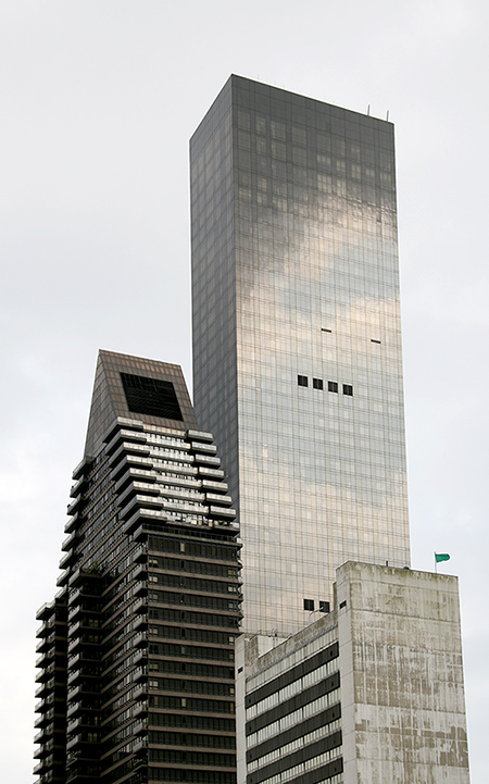 That said, today I bring you two glass towers (two-for-one to carry you through the weekend). The building in the foreground is the 52-story 100 United Nations Plaza, a luxury condominium tower on the northwest corner of 48th Street and First Avenue, completed in 1986 (click here for 2nd photo). You can’t miss this one, with its signature wedge-shaped roof in eight steps, featuring penthouses with multiple balconies. The building is surrounded by a landscaped plaza with gardens and fountains. It was designed by Der Scutt, an architect with quite a pedigree who has done numerous NYC projects, including Trump Tower on Fifth Avenue, the Grand Hyatt Hotel, and the Corinthian luxury condominium.