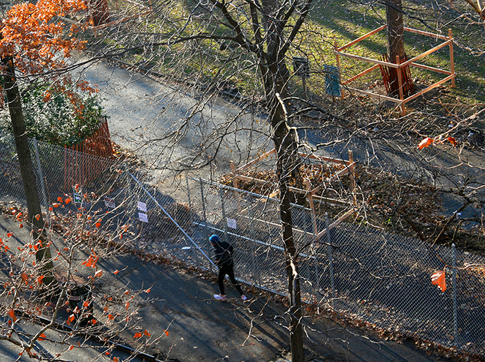 I joke around about my fascination with prison documentaries, typically entitled something like Lockdown, which are presented with great drama. The drama here in the Village is at least as great with a war that has gone on for some time between community activists and the Parks Department and their plan to completely redo Washington Square Park, with activists preferring a rehab versus wholesale reconstruction. All agree that the park is in serious need of repair – the last renovation was done in 1967. The details of this battle (which is a replay of previous ones in this activist community) and its raison d’etre have been told blow by blow from the local papers all the way to the New York Times. My previous posting from May gives an overview of the various issues at hand, with links and more photos. Lawsuits have been brought against the City of New York (the last of which the city won), and on the week of December 10th, workers moved in, fenced off over half of the park, and began construction (which will be done in two phases in an estimated 2-3 years). Phase 1 is larger and includes the fountain area and plaza around it, where most gatherings and activities take place. In the warmer weather, it will be interesting to see how the regulars and visitors adapt to the very limited space.