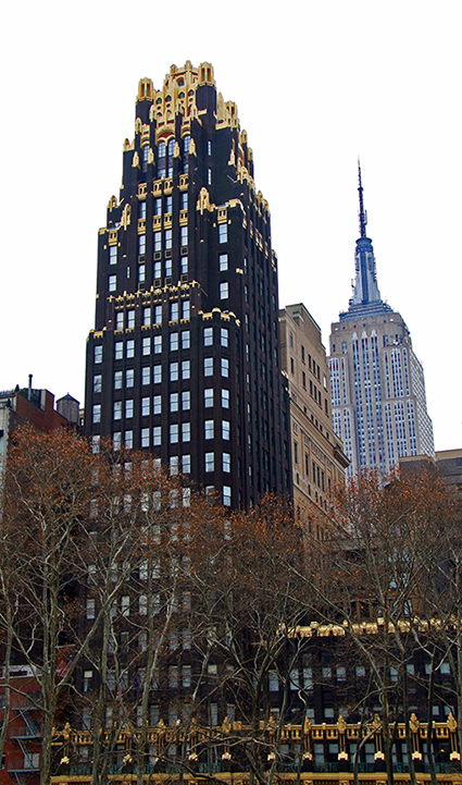 designed by architects Raymond Hood and John Howells and built in 1924 for the American Radiator and Standard Sanitary Company. It is based on the Chicago Tribune building. The building is located at 40 w. 40th Street on a block with many brownstones and Renaissance club facades from the turn of the century. It is on the south side of Bryant Park, thus affording unobstructed views of it from some distance. The stark contrast in colors is a distinguishing characteristic and a remarkable sight, well-known to city dwellers who frequent the area. The brick is black – Hood wanted the appearance of a large mass, unbroken by dark windows in a building typically constructed using lighter-colored stone. The building is topped with Gothic style pinnacles and terra-cotta friezes covered in gold. The design was to recall the furnaces of the time, with their black iron and glowing embers.