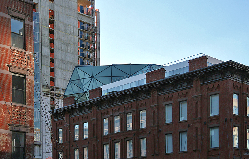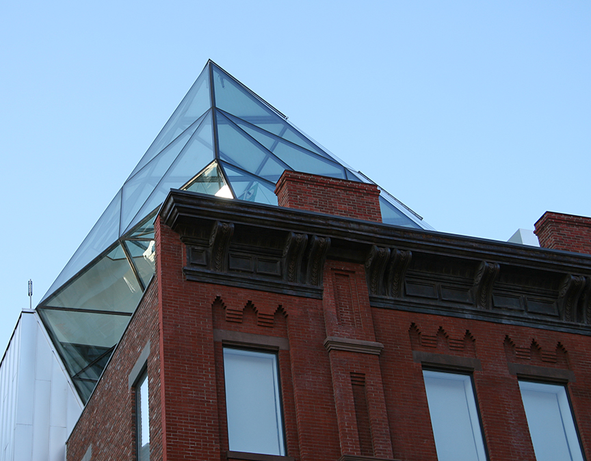 The glass prism-like roof structure provides illumination for von Furstenberg’s penthouse/design studio; the structure is modeled after a piece of jewelry she designed for jeweler H. Stern. The building itself, which she restored to its former 19th-century appearance, will be used for manufacturing and commercial use. It is very atypical these days to see a conversion to non-residential use. Approval of the design was quickly had – most applauded and welcomed the restoration. Some, of course, disliked the prominence of the rooftop prism.