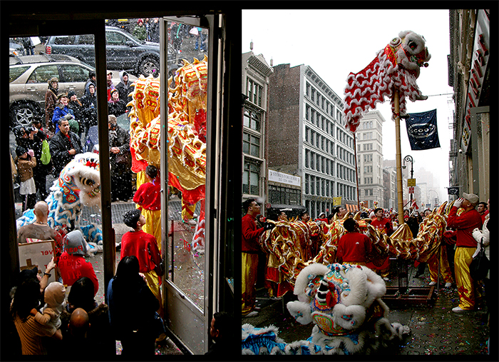 A friend and I decided to make a short pilgrimage to Chinatown and ran across a celebration in front of Pearl River Mart (click here for a previous posting on this large Chinese department store). We arrived just in time to see the traditional dragon and lion dance, accompanied by a snow shower.