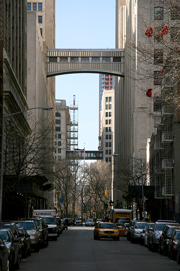 So what better little comfort can one imagine than an enclosed pedestrian walkway (a.k.a. skyway or sky bridge) between buildings? I was startled at the sight of two while walking along Lexington Avenue and peering westward down 24th Street. It was a photo begging to be taken.