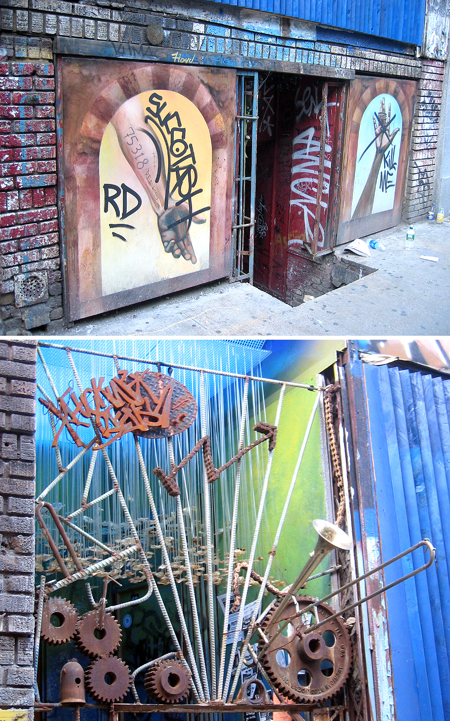They are surrounded by the changing demographic of the neighborhood, which is now becoming a place of fashionable and expensive restaurants and designer stores, in spite of the deliberately grungy aesthetic that is embraced. The front of the building, whose ownership has been in dispute all along, is decorated with salvaged metal parts and murals depicting moments of nihilistic despair, somewhat ironic because the general aims of the organization are very optimistic – art studio access for everyone, fair and affordable housing, and educational outreach to the unfortunate, such as prisoners. More photos here…