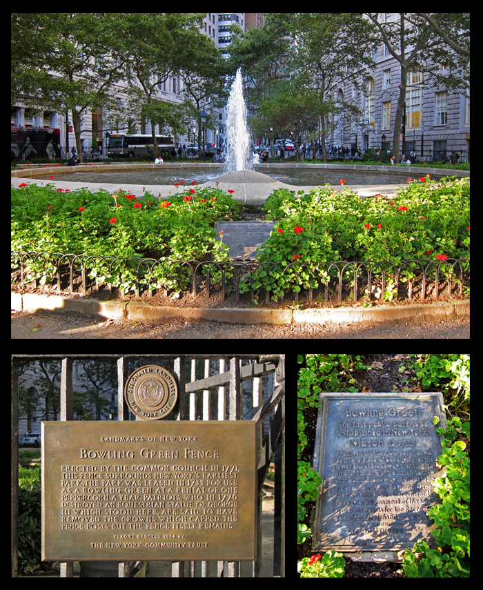 Bowling Green is New York City’s oldest park. According to tradition, this spot served as the council ground for Native American tribes and was the site of the legendary sale of Manhattan to Peter Minuit in 1626. The Dutch called the area “the Plain” and used it for several purposes. It was the beginning of Heere Staat (High Street, now Broadway)—a trade route which extended north through Manhattan and the Bronx. It was also the site of a parade ground, meeting place, and cattle market. In 1686 the site became public property and was first designated as a park in 1733, when it was offered for rent at the cost of one peppercorn per year. Lessees John Chambers, Peter Bayard, and Peter Jay were responsible for improving the site with grass, trees, and a wood fence “for the Beauty & Ornament of the Said Street as well as for the Recreation & delight of the Inhabitants of this City.” A gilded lead statue of King George III was erected here in 1770, and the iron fence (now a New York City landmark) was installed in 1771. On July 9, 1776, after the first public reading in New York State of the Declaration of Independence, this monument was toppled by angry citizens, dragged up Broadway, sent to Connecticut, melted down, and recast as ammunition.