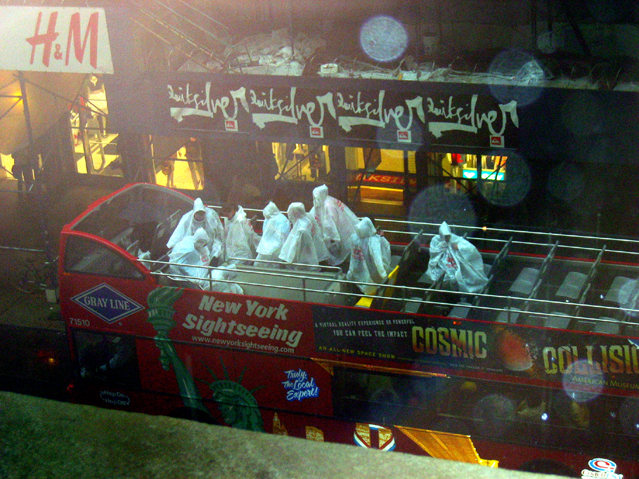 The open upper level of the double decker buses appears to be the preferred seating, unless it rains – then you had better put on your free raincoat and run inside, because this is New York and there’s no refund for you 🙂