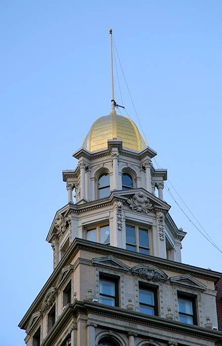 The photo is of the two-story, octagonal, gold-leaf cupola atop the Sohmer Piano Building at 170 Fifth Avenue in the Flatiron/Chelsea District. Designed by Robert Maynicke and built in 1896 by developer Henry Korn, the 13-story landmark Beaux-Arts building was once a piano showroom. After residential conversion, the cupola was was purchased in 2001 by Gregory C. Carr, former chairman of Prodigy.