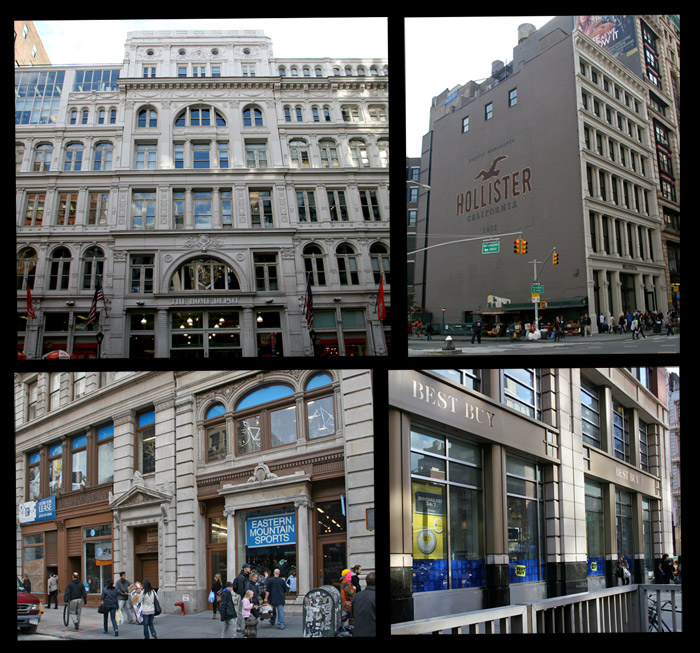 Large chain retailers also have their own difficulty of acquiring adequate space. The challenges and costs are huge, and these large retailers are late comers in the New York City retail landscape. Many of these huge stores occupy architecturally beautiful spaces, almost of necessity since these are the only types of buildings with enough open space to accommodate their needs – places like Home Depot, Trader Joe’s, Kmart, Costco, and Best Buy. Some take creative approaches, like EMS, who acquired a number of contiguous spaces across adjoining buildings. Others, like Hollister or Apple, stage a coup by acquiring an entire building, permitting spectacular interior design.