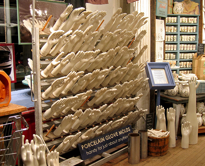 The photo was taken in Fish’s Eddy (named after a small town upstate New York) on lower Fifth Avenue. The display of porcelain hand molds was very striking – I’ve never seen this many together. These molds are used for rubber glove manufacture – they are dipped in a liquid latex and removed. Once dried, the latex is stripped off, and voila – a latex glove. I read that these molds are quite common in antique shops and are used around the home as a decorative item. With a little imagination, I’m sure many uses can be found – the sign below them assures us that they are “handy for just about anything.” Or perhaps this is a display which sells things for nothing 🙂