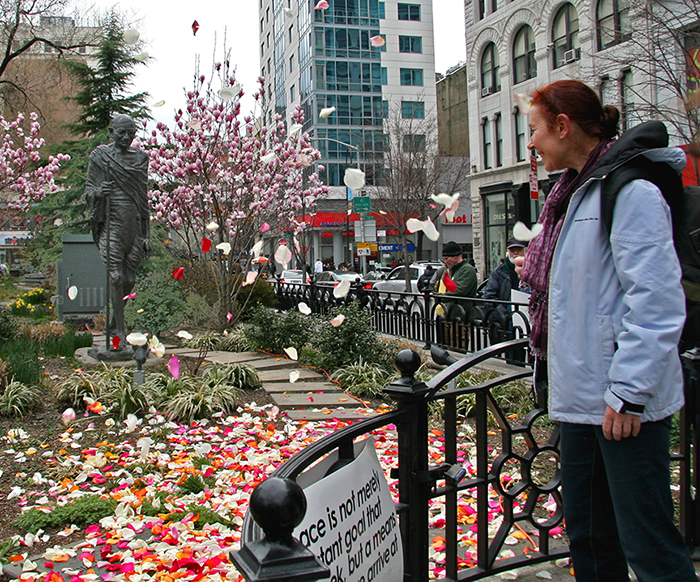 Union Square can always be depended on as a locus for political activism. Saturday afternoon was the Be the Change walk – the initiation of a month-long tribute to Mohandas K. Gandhi. The walk started in four different locations and ended in Union Square near the Gandhi statue, where a number of speakers were present for the commemoration, including composer Philip Glass, author Mark Kurlansky, and author/activist Reverend Osagyefo Uhuru Sekou. There was also a traditional flower petal ceremony. The Iraq War was, of course, foremost in the minds of the participants, many of whom carried large signs with quotes from Gandhi: Outer peace is useless without inner peace and An eye for an eye makes the whole world blind.