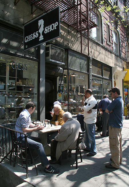 The Chess Shop was opened in 1972 by George Frohlinde. In the 1960s, he ran a shop owned by International Grandmaster Nicholas Rossolimo. At the time, there were a number of chess shops in this area. Sometimes referred to as the “Chess District”, only two shops remain: the Chess Shop at 230 Thompson Street and a new competitor across the street, the Chess Forum, opened in 1995 by one of Frohlinde’s employees, Imad Khachchan. The Chess Shop is opened 365 days from 11AM to midnight and provides a place for playing at a nominal hourly fee. They also are known for their selection of a myriad of unique-themed chess sets, many of which can be seen in their windows – eyestoppers for most passersby. See them and learn more about the shop at their website. I suggest you visit soon…