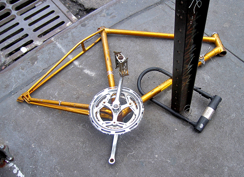 Such a sad state of affairs when people resort to ripping off the parts. A couple of years ago I went to Savannah with my daughter’s Girl Scout troop and the first thing that greated us as we stepped up to street level from the parking lot…was this exact type of scene. All that as left was on mangled bike tire chained up to the bicycle rack. What a sad impression it gives when visiting a city.