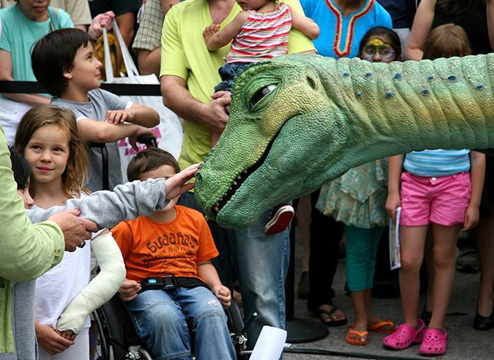 The central event was Lucky the Dinosaur, a free-roving audio-animatronic figure created by Disney’s Imagineers over a period of five years and unveiled in 2005 (audio-animatronics were invented by Disney and made their major debut in 1963 with a display of singing birds and flowers at The Enchanted Tiki Room at Disneyland Resort).