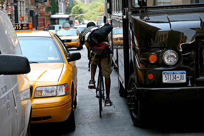 You beautifully illustrate what is indeed a dangerous job, Brian. You also inadvertently illustrate one reason it is dangerous–not just for the messengers, but for pedestrians. The messenger in the photo is going against the traffic. Manhattan is a grid of mainly one way streets, and pedestrians stepping off a curb are always looking in the direction the traffic is coming from. They will not see this messenger until they step into his path. Countless people have been seriously clocked by cyclists going the wrong way.