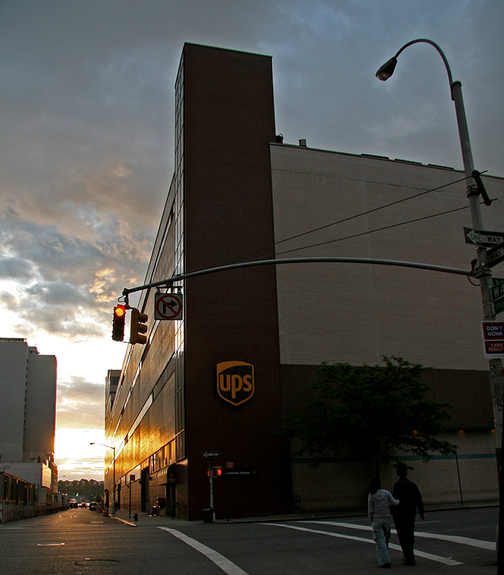 This virtually windowless, monolithic, hulking behemoth quietly sits at 601 West 43rd Street, relatively unnoticed by most, with perhaps the exception of those whose business takes them there. It is the main headquarters for UPS (United Parcel Service). It occupies a full city block from 43rd to 44th Street and from 11th to 12th Avenues. With the exception of the Jacob Javits Center or excursions to Hudson River waterfront attractions, visitors rarely make it to or through here. This area of Eleventh Avenue is populated with auto dealers and other commercial businesses.
