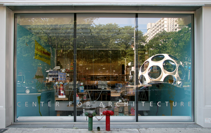 The window is that of the Center for Architecture, the New York chapter of the American Institute of Architects. Buckminster Fuller and his work is an enormous subject. Read about him here. There is also more information about Fuller at the Dymaxion Study Center at the AIA Center at 536 LaGuardia Place from 6/23/08-9/14/08.
