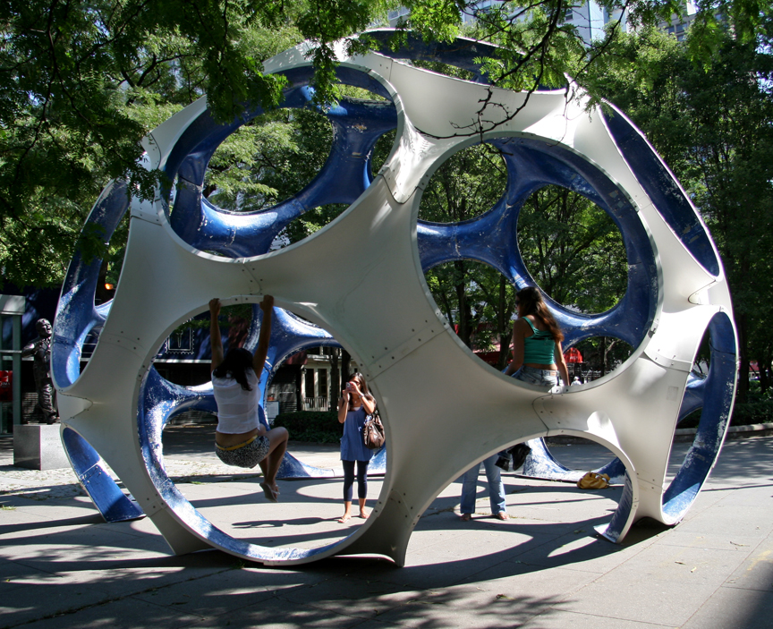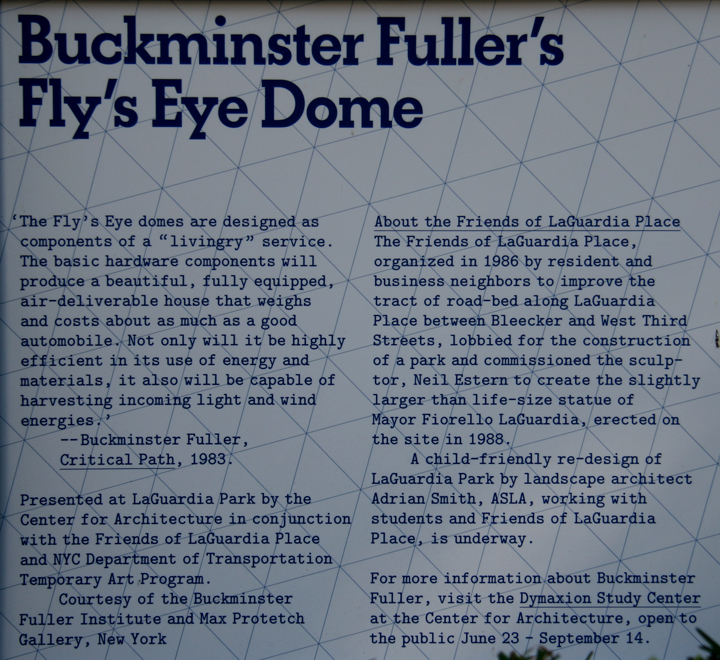 The one in the photo that can be seen in the window reflection is Fuller’s Fly’s Eye Dome, which has been erected in LaGuardia Park across from the AIA center. Read about the sign here. See here for photo of dome with a few visitors climbing the structure.