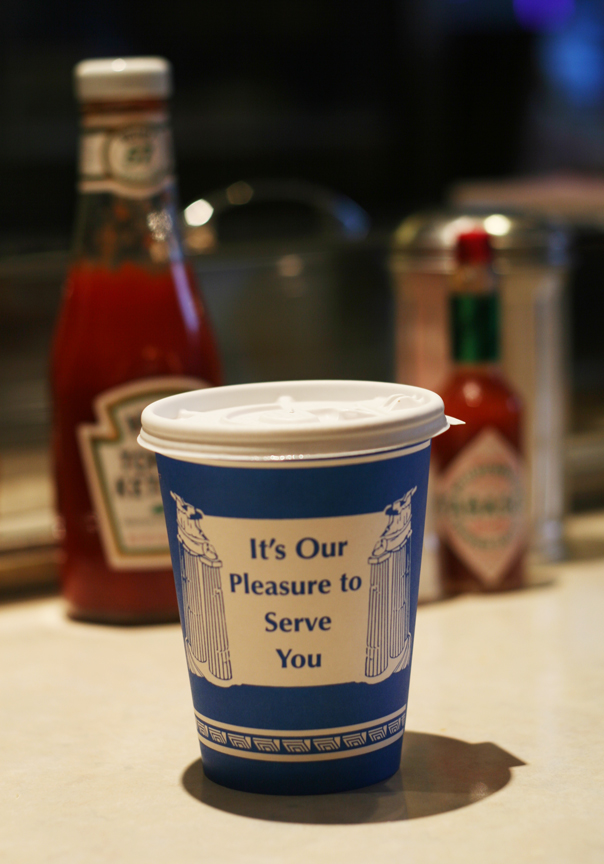 There are a number of competing brands of the Greek coffee cup, but all have some variation of the original message “We are happy to serve you.” The one in the photo is no. 110 by Premier Paper Manufacturing Corp., circa 1997. A set of Corinthian columns graces the front with the words “It’s our pleasure to serve you” and a discus thrower on the back. The original design is now owned and manufactured by Solo Cup Company. See the link here for a gallery of Greek-motif cups.