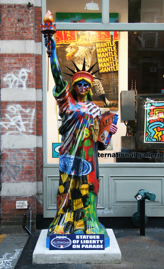 “To mark the July 15 All-Star game at Yankee Stadium, 42 baseball-themed Statues of Liberty are on display in New York. The Stephen Holland statue, Pop International Galleries, 473 West Broadway, at Houston Street, in SoHo area of Manhattan, celebrates the artist commissioned to paint them all. Apparently, he was so intent on having 42 to honor Jackie Robinson, he made one for himself.”