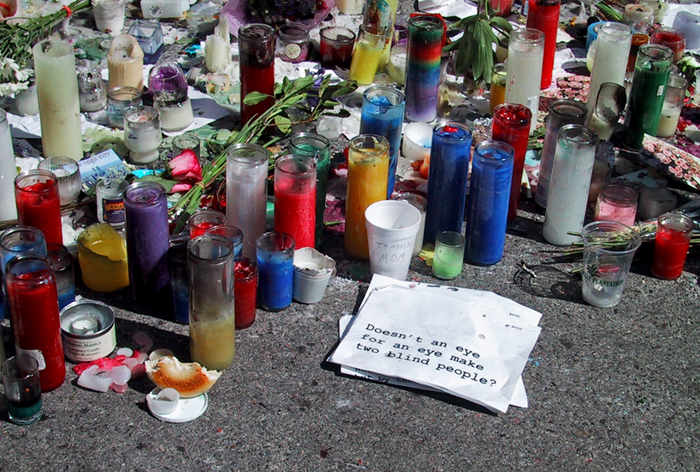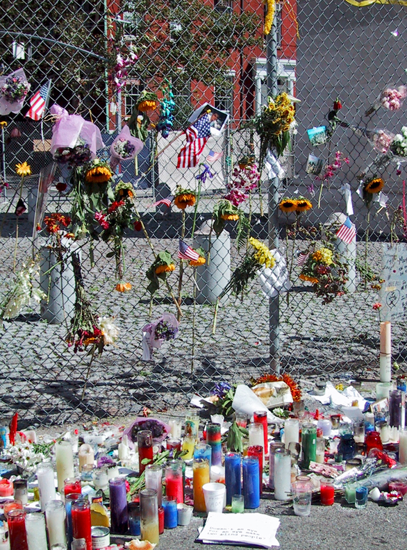 Today I have opted to post one of my original photographs of a memorial site against a fenced-in area surrounding Washington Square Arch in the Village, taken in 2001 (see second photo here). This site was one of many spontaneous occurrences throughout the city. One remarkable thing about all of these sites was the universal regard they were shown for the long periods of time that they remained. Like the ghost bikes around town, these displays of candles, flowers, and personal notes were left unprotected but remained unaltered.