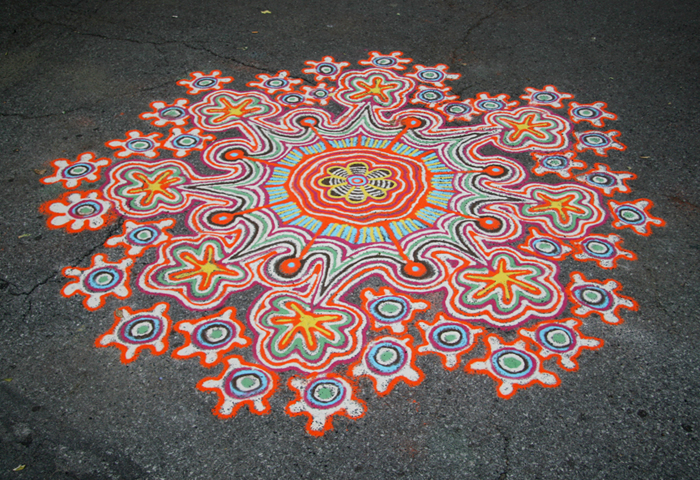 On the other hand, if you want an easy task of finding beauty, I recommend that you fix your sight on the work of Joe Mangrum, whose work in the photo graced the pavement in Washington Square Park for the last few days. It was a showstopper and appeared to please every passerby. See a second photo here. These sand paintings were created in brilliant colors – unprotected like sandcastles, their slow dissolution a necessary feature of this type of installation. See more of his work at his website.