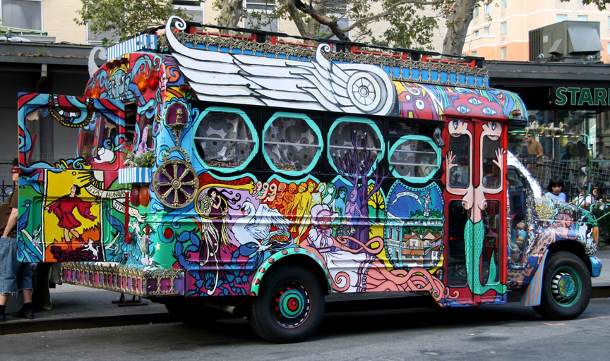 I have passed by both this art bus and the street vendor with her table of recycled clothing numerous times. I never knew that there was a connection between them. So for the first time, I made the acquaintance of Kat O’Sullivan, who graciously greeted me when seeing my interest in photographing her vehicle. She invited me to go inside her bus. You can also see her recycled clothing , details of her life, art projects, and media articles at her website, Katwise.com.
