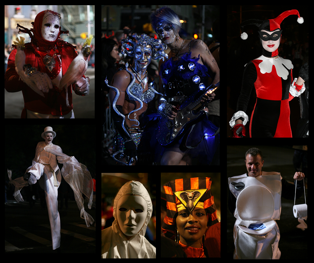 However, since the inception of this blog, I have obtained a press pass, allowing me to roam freely among the paraders. This privilege is extraordinary, as the parade has become virtually unmanageable with the enormous number attending – estimated at 2 million. The history of this parade is an artistic one, so the costuming is particularly creative. Many plan for this in advance with enormous amounts of preparation. There are floats and very elaborate displays. The standards are high and the number of participants is huge; it is difficult to see more than a small fraction of the outstanding costumes. Tomorrow I will post another collage as Part 2 and a gallery of photos on my Flickr site…