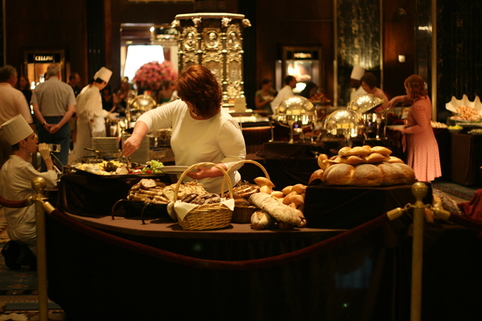 In the course of my visits there, I have watched the magnificent spectacle that is the Sunday brunch. This minor weekly event is served in the Main Lobby of the hotel, so the nonparticipant can easily see the offerings in what has to be one of NYC’s finest brunches. Diners are seated in the Peacock Alley restaurant (opened in 1931) and private dining salons.