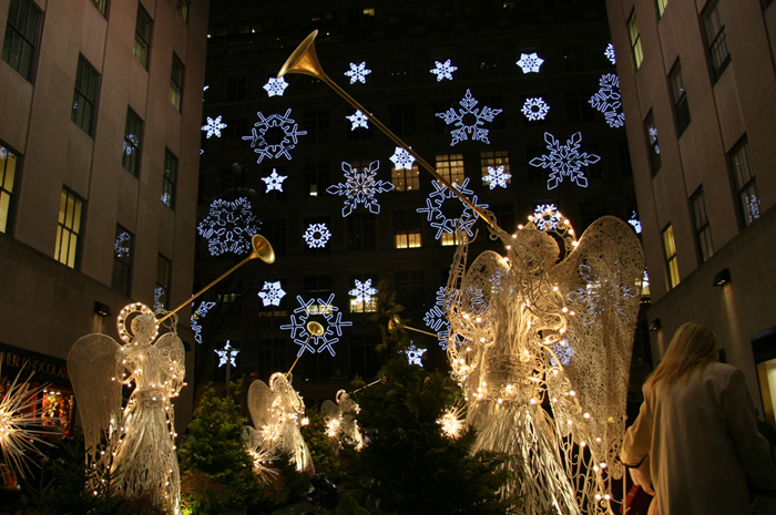 Assuming you want to feel the Christmas spirit, I suggest you head for Fifth Avenue between 49th and 59th Street. The place to start, of course, is at the Channel Gardens Promenade at Rockefeller Center. Here, you have so many iconic views: the Christmas tree, ice skaters in the sunken plaza with the gilded statue of Prometheus (sculpted by Paul Manship), and the gardens lined with illuminated angels.