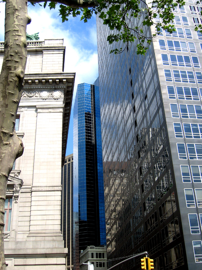 This photo was taken at the exit from the Staten Island Ferry terminal at State Street near Battery Park, where there are also ferries to other locations, such as the Statue of Liberty, Ellis Island, and Governors Island. Downtown has the greatest mix of the early skyscrapers with the ultramodern. There is now a new Skyscraper Museum at Battery Park City.