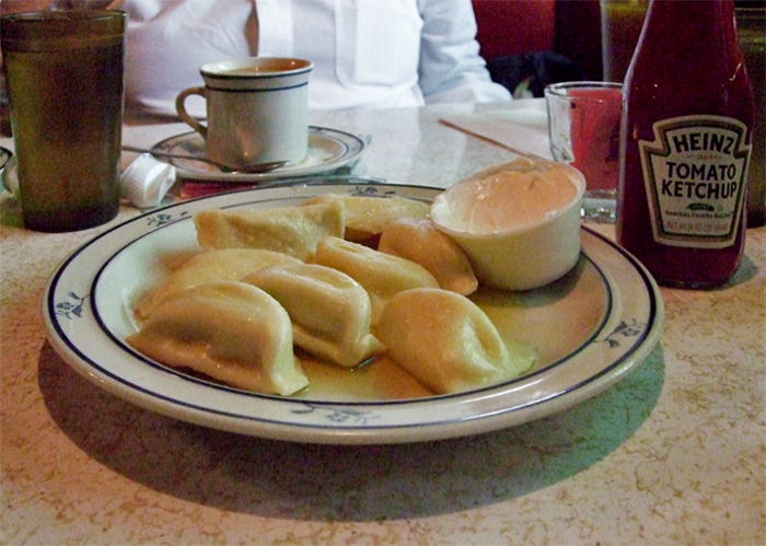 There used to be a place, maybe on East 9th St and 1st Ave, Leshko’s. Used to have lunch there. Good soup and pirogi. Nasty waiters. Now I’m hungry just thinking about it. Note the sour cream. But ketchup? No, no, never.