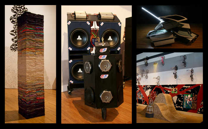 In a small side gallery, an assemblage of car doors with a neon tube, Door Pile, by Corey D’Augustine, was being shown. In the main exhibit room, a number of BMX-style bikes affixed to the walls and skateboard ramps was featured.