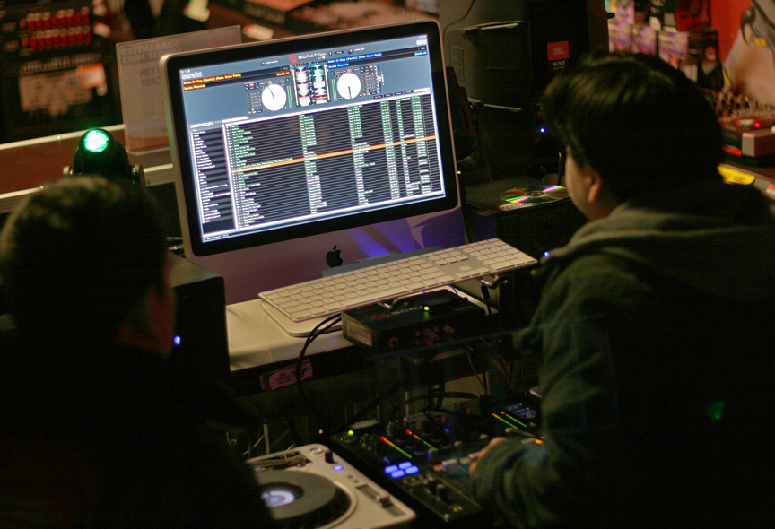 I recently stopped into the Guitar Center on 14th Street with a friend who was unfamiliar with the place. My tour included a room I had never entered which was filled with DJ gear. Three Latino men were playing with a CD player with a pressure-sensitive scratch disc interfaced with an iMac. The equipment allows the manipulation of digital media as one would manipulate vinyl LPs. Fascinated, I watched them test the gear. I took some overhead “hail Marys”* and got a few acceptable photos.