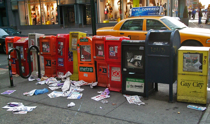 I’ve noticed that the Village Voice added staples to their spines this year, and I wonder if it isn’t connected to the litter problem. Prevents all the “adult encounter” pages from plastering the street. Its about the only thing left in the village voice to look at!