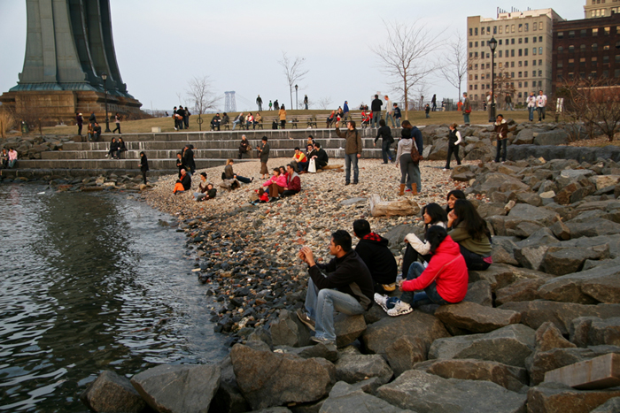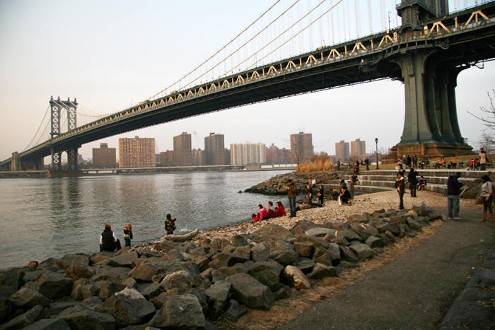 The photo was taken on the rocky beach in Dumbo at the foot of the Manhattan Bridge looking northwest towards Manhattan – you can read about it here with more photos. This area is one of the most scenic in New York City – both the neighborhood itself with buildings, cobblestone streets, the East River waterfront, our trinity of bridges (Brooklyn, Manhattan, Williamsburg), and vistas of the Manhattan skyline. That’s a lot of punch for your dollar, and these people were delighted to spend it 🙂
