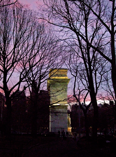 PHOTO NOTE: I witnessed this dramatic pink and blue sky framing the Washington Square Park arch on Wednesday evening, March 11, 2009, at 6 PM.