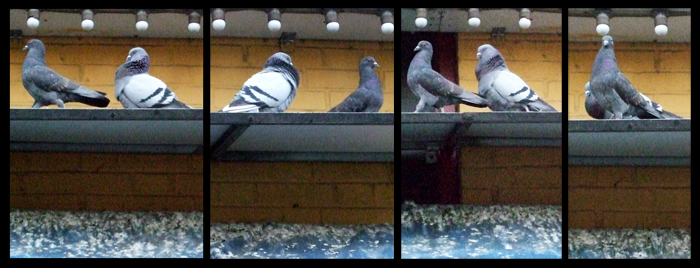 The recently vacated Mexican restaurant, Senor Swanky in Greenwich Village at Bleecker and Laguardia, was a place that proclaimed itself as a “celebrity hangout” on its signs, a source of hilarity for a number of us neighborhood residents. It has been closed since July 2008, and its awnings and ledges have become a very busy pigeon roost, with droppings everywhere. In observing this appropriately consecrated place (the restaurant was dreadful, from what I have read), I observed the mating ritual of two pigeons in a very linear style, confined as they were to the edge of the canopy. Left to right, right to left, left to right. Persistence is part of the game.