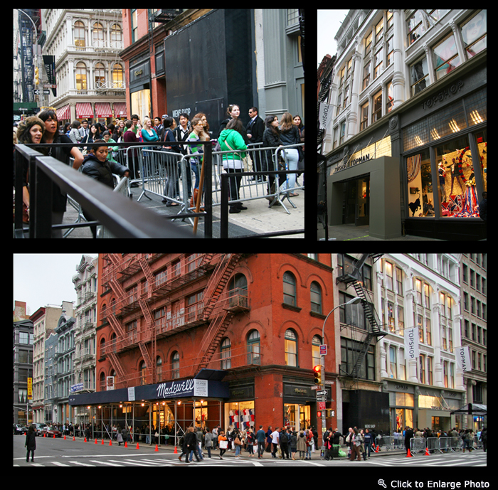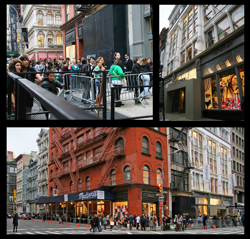 Yes, in NYC, stores openings are occasionally media events. Topshop, a British-based clothing chain of over 100 stores, opened its first US store yesterday at 478 Broadway (south of Broome Street) in SoHo. What we have here is where buzz meets the American passion for shopping. The awaited opening was covered by every local media group. For over a week before the opening, a pink Topshop van had been busy giving out free tote bags which included gift cards worth up to $500.