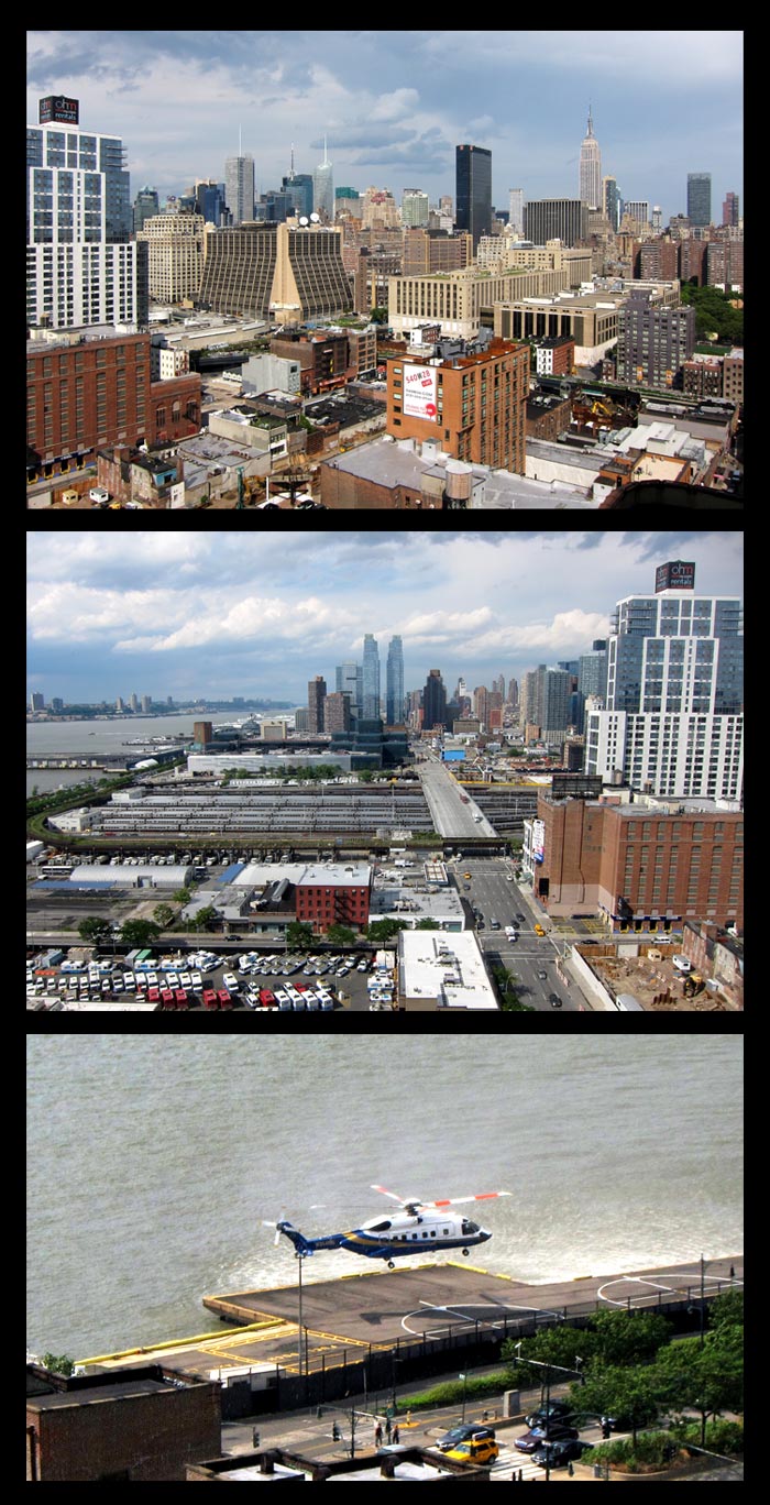 It was a Sunday afternoon, June 3rd. The neighborhood and building were essentially deserted. The showroom was small and spare. The whole experience was rather depressing until I moved towards the windows, which had unobstructed views North, East, and West. Helicopters were taking off and landing from the heliport, affording me the kinds of views I had hoped for when I originally visited. Looking northeast were the Chrysler and Empire State Buildings, as well as many lesser-known players in the game of one-upmanship by New York City’s tall buildings.