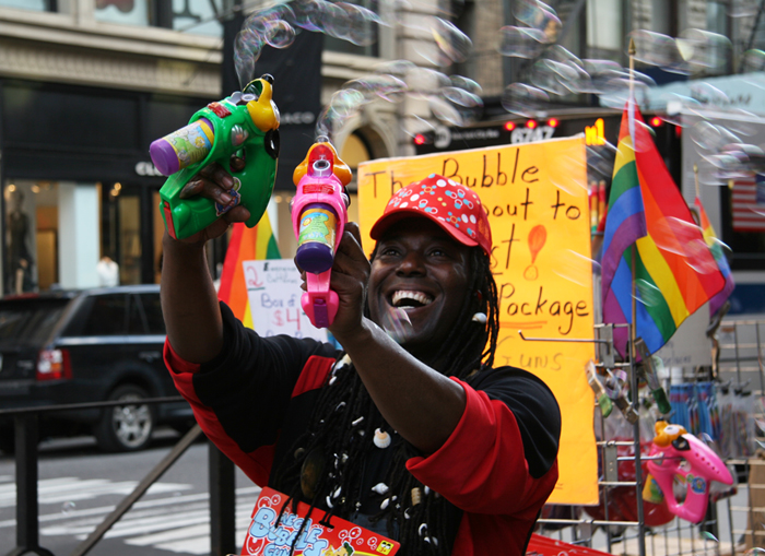 Dondi McKellar is a man. In fact, he is a disabled veteran, having served six years in the United States Navy. He hails from North Carolina, and he has been a New Yorker since 1985 and selling Bubble Guns on the streets of SoHo for the last four years. A short conversation with Dondi quickly established that beneath his smile lived a warm human being. He was quite happy to share details of his life, show me his vendor permit, and encourage my photography.