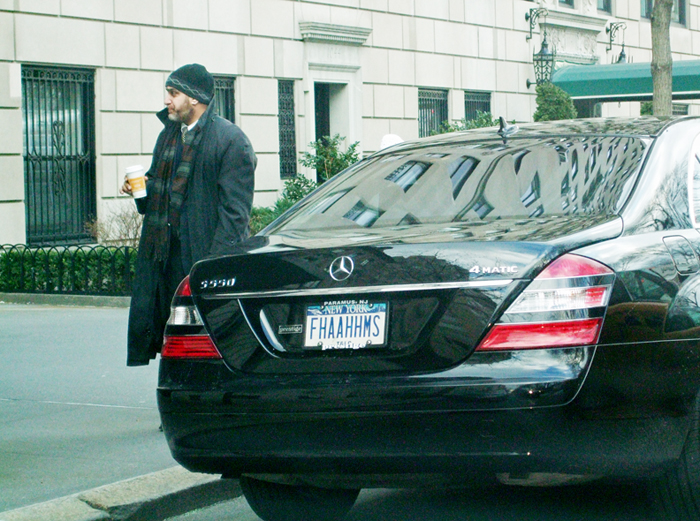 We observed a few things. The vehicle was a car for hire, indicated by the T&LC (Taxi and Limousine Commission) at the bottom of the license plate. The man hovering was obviously the driver waiting for his client. This was not an ordinary client for several reasons. The vehicle was a Mercedes, parked outside an extremely fancy doorman building on Fifth Avenue in one of the most prime locations in the city. Lastly, and most interesting to us, was an odd sequence of letters, FHAAHHMS, which certainly must be a vanity license plate.